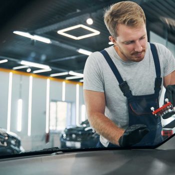 Beim Austausch der Frontscheibe trennen wir die beschädigte Scheibe vorsichtig heraus. Die elektronischen Bauteile (z. B. die Kamera an der Windschutzscheibe) werden abgebaut und für die neue Scheibe bereitgehalten. Alle Montageflächen werden sorgfältig gereinigt und die neue Windschutzscheibe wird mit einem Hochleistungskleber präzise eingepasst. Unsere Profis arbeiten dabei mit lackschonender Präzision und gehen mit empfindlichen Oberflächen sehr vorsichtig um.